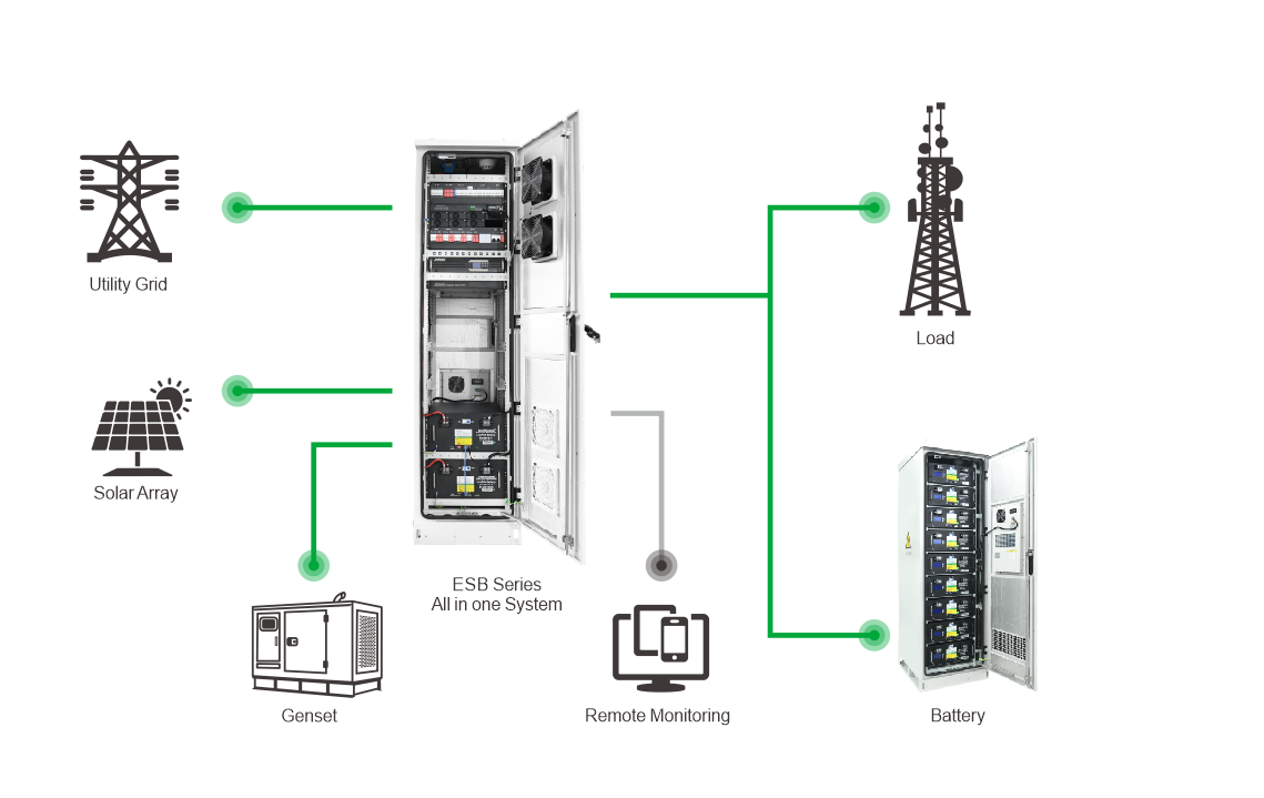 Unsere neu entwickelten Telekommunikations-Gleichrichtersysteme der ESB-Serie basieren auf dem Konzept eines integrierten, multifunktionalen Stromversorgungssystems für Basisstationen. Sie vereinen Gleichrichtermodul, Solar-MPPT-Modul, Wechselrichter, Lithiumbatterie, Überwachungsmodul, Klimaanlage, Stromverteilungseinheit (PDU) und Basisstationsschrank auf einer einzigen Plattform und bieten so eine Komplettlösung für die Infrastruktur von Basisstationen. Wie dieses Projekt zeigt, können wir alle Arten von Telekommunikations-Gleichrichtersystemen der ESB-Serie individuell an die Projektanforderungen unserer Kunden anpassen – flexibler, zuverlässiger und kostengünstiger.