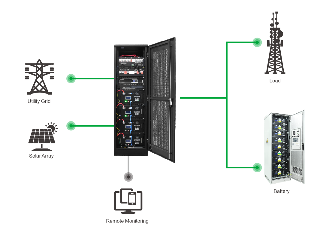 Die kundenspezifischen Telekommunikationsgleichrichtersysteme der ESB-Serie sind nach dem Konzept eines „integrierten multifunktionalen Basisstations-Stromversorgungssystems“ konzipiert. Sie umfassen das Gleichrichtermodul, das Solar-MPPT-Modul, den Wechselrichter, die Lithiumbatterie, das Überwachungsmodul, die PDU (Stromverteilungseinheit) und den Basisstationsschrank auf einer einzigen Plattform.