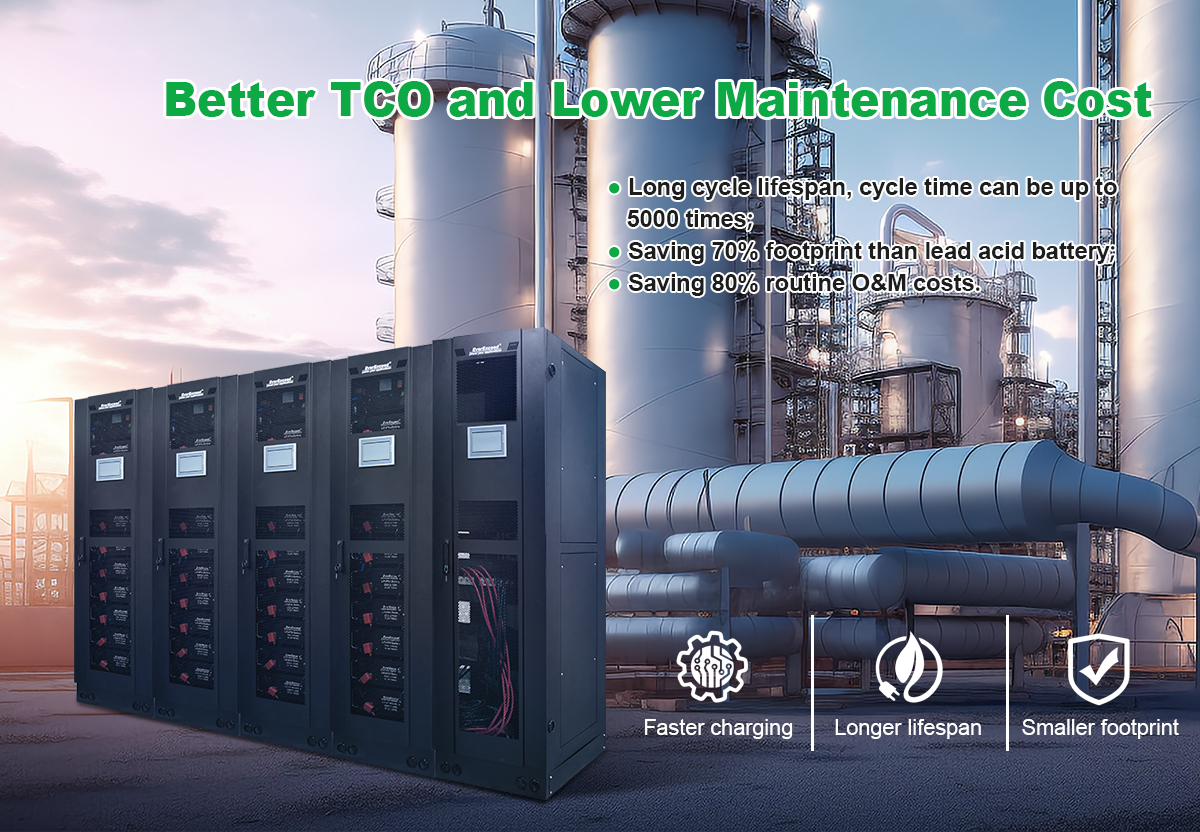 Erzielen Sie bessere Gesamtbetriebskosten mit bis zu 5.000 Zyklen, 70 % Platzersparnis und 80 % niedrigeren Wartungskosten im Vergleich zu Blei-Säure-Batterien.