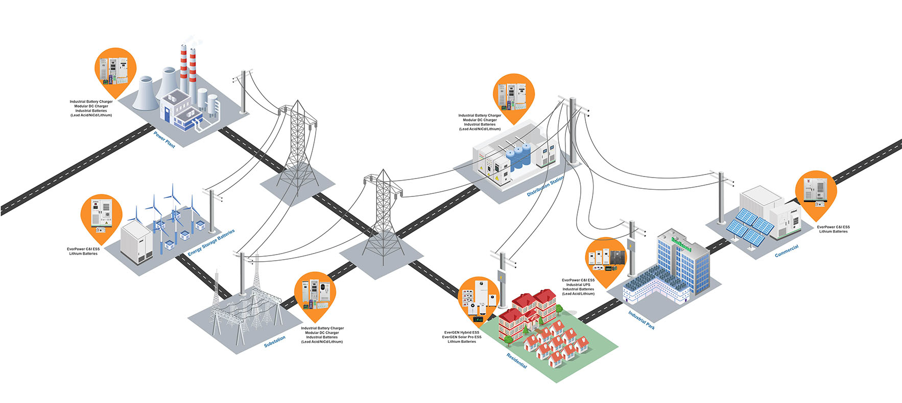 EverExceed bietet skalierbare Gleichstromsysteme, industrielle Ladegeräte und Energiespeicher zur Unterstützung von Umspannwerken, Schaltanlagen und Hoch-/Mittelspannungs-Übertragungsknoten.