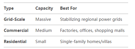 Große Systeme (Hunderte bis Tausende von kWh) unterstützen größere Betriebe oder industrielle Anwendungen.