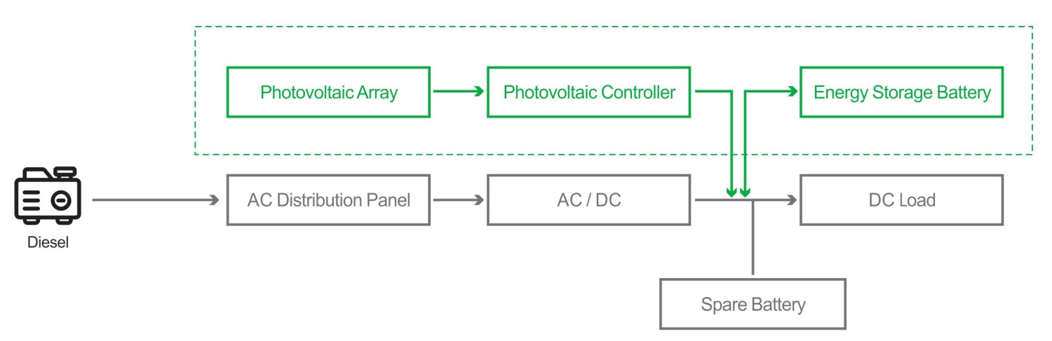 Diese Hybridarchitektur (PV + Batterie + Diesel) gewährleistet eine saubere, stabile und kosteneffiziente Stromversorgung der Basisstation.